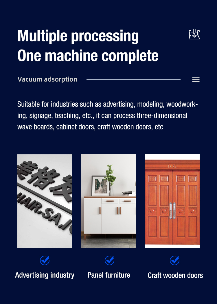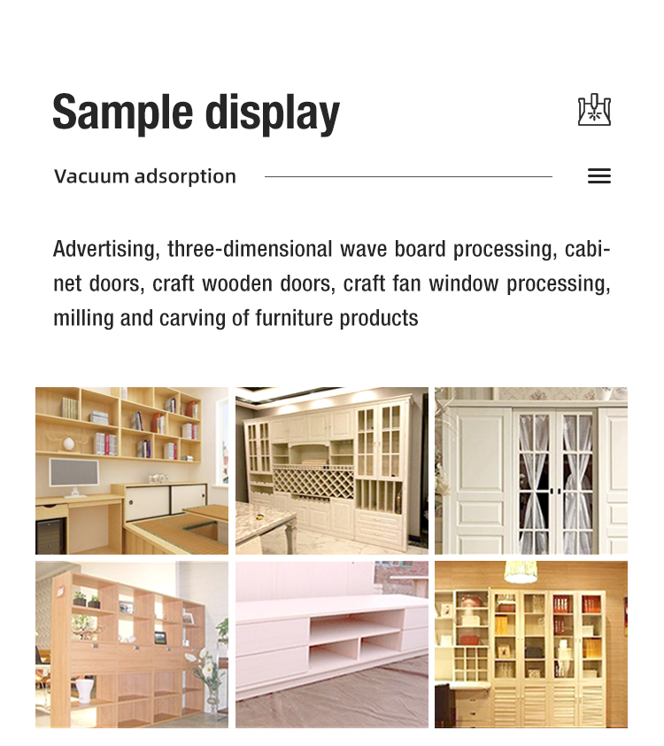 This machine is suitable for coffin, shoucai, wooden door, embossment carving, also can do three-dimensional wave board processing, screen art window processing, computer table and board home products auxiliary processing.